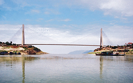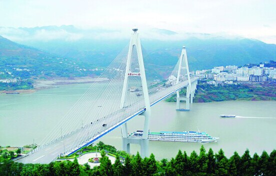 巴東長江公路大橋:建設總長2100米,橋長900.5米,主跨388米,為五跨連續雙塔雙索面預應力砼斜拉橋。橋面寬19米(不含錨索區),設四車道及兩側各1.5米寬的人行道,北主塔高212米,時居同類型橋...