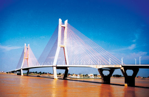 湖北鄂黃長江大橋全長3245米,主橋長1290米,主跨480米,主塔高172.3米,五跨連續雙塔雙索面預應力砼斜拉橋,其主跨居同期同類橋梁亞洲第二、世界第三,2002年9月建成通車。其施工創造了一年完成水下基礎并提前一年完工的長江中下游特大橋施工記錄,被交通部譽為“長江大橋建設的典范”。獲2004年四川省天府杯金獎、2006年國家優質工程銀獎等榮譽。